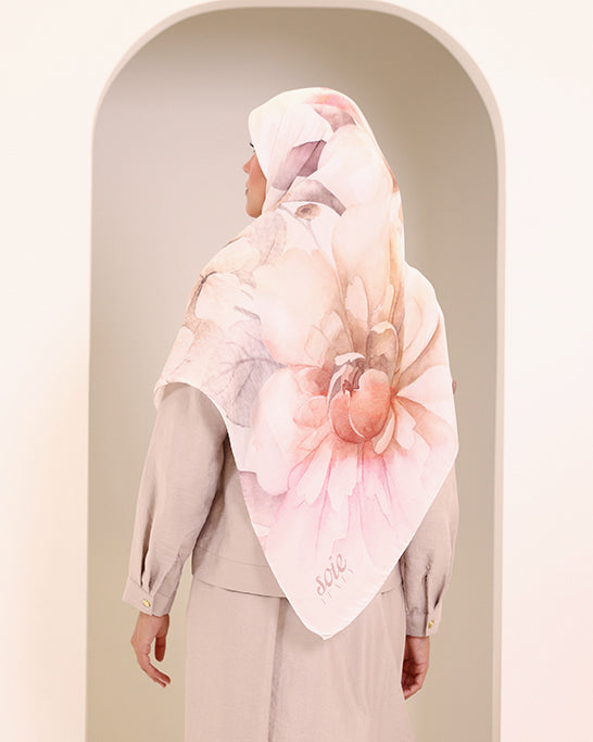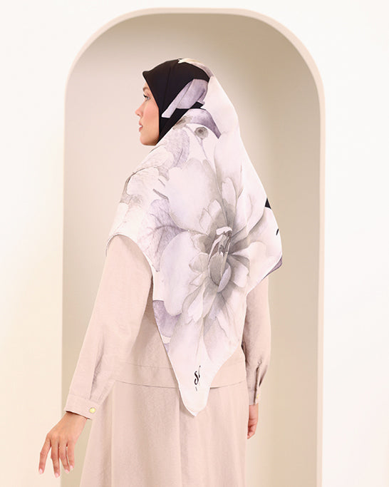 Italy silk scarf, large peonies on black/white background, shown laid on a table